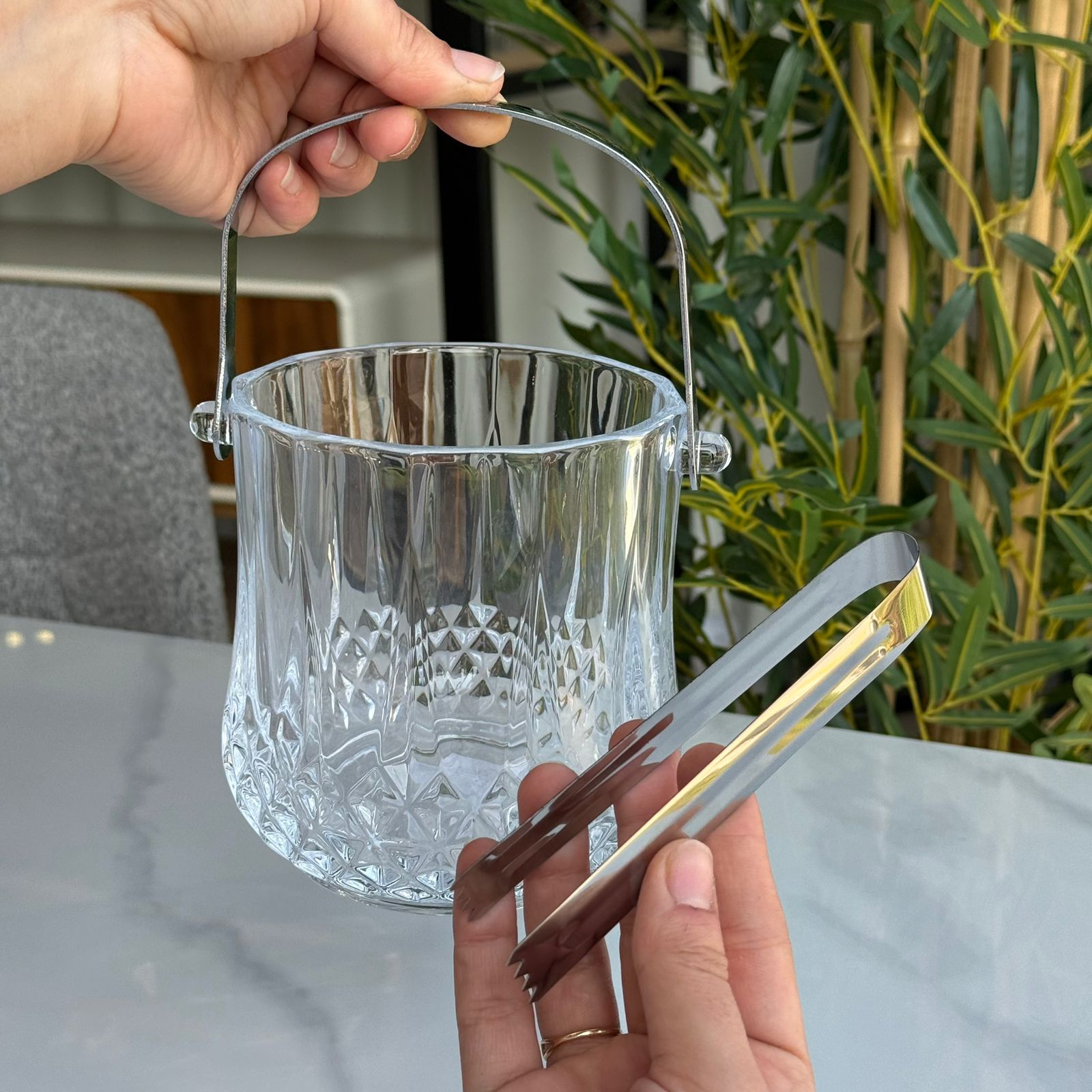 Classic Cut Glass Ice Bucket with Metal Handle & Tongs