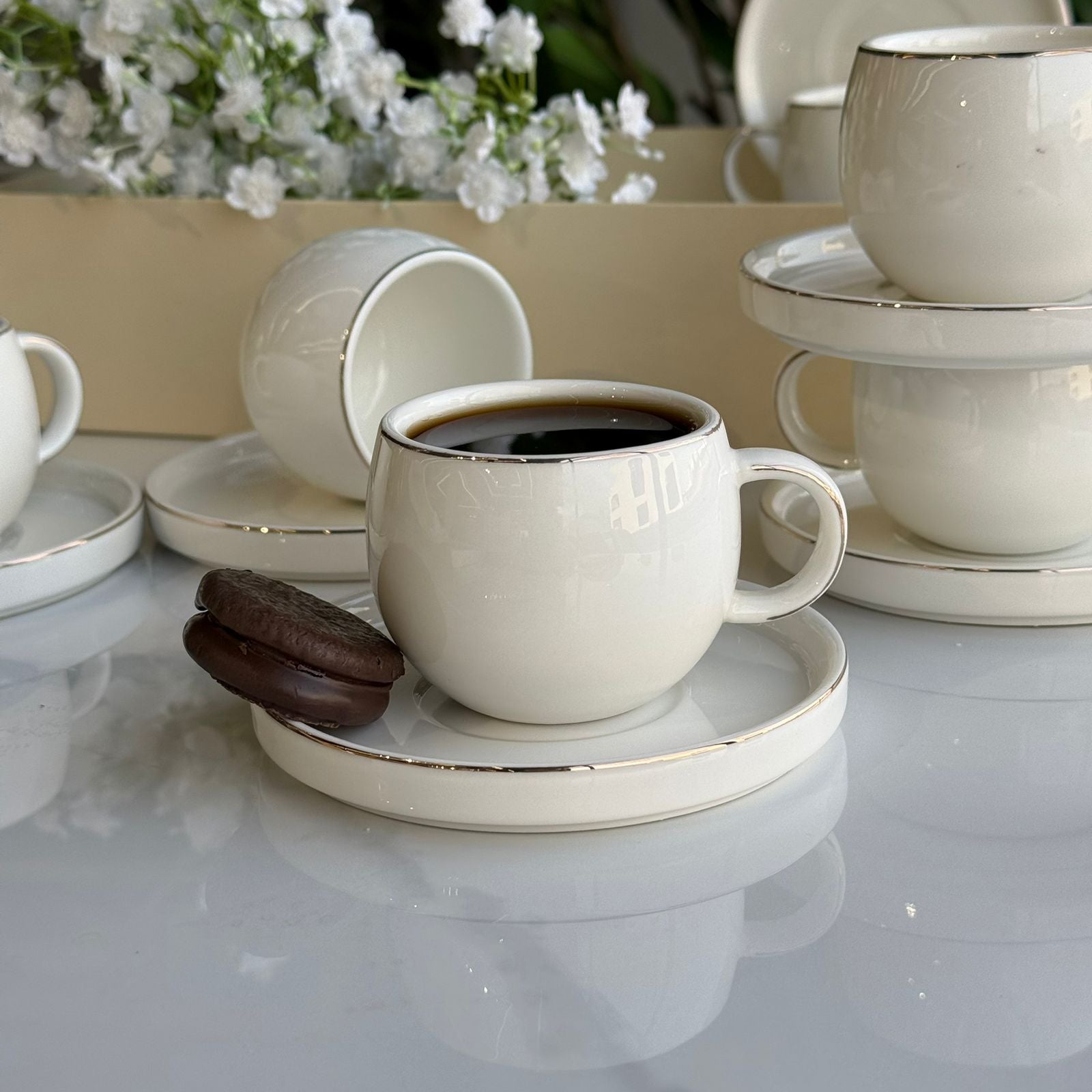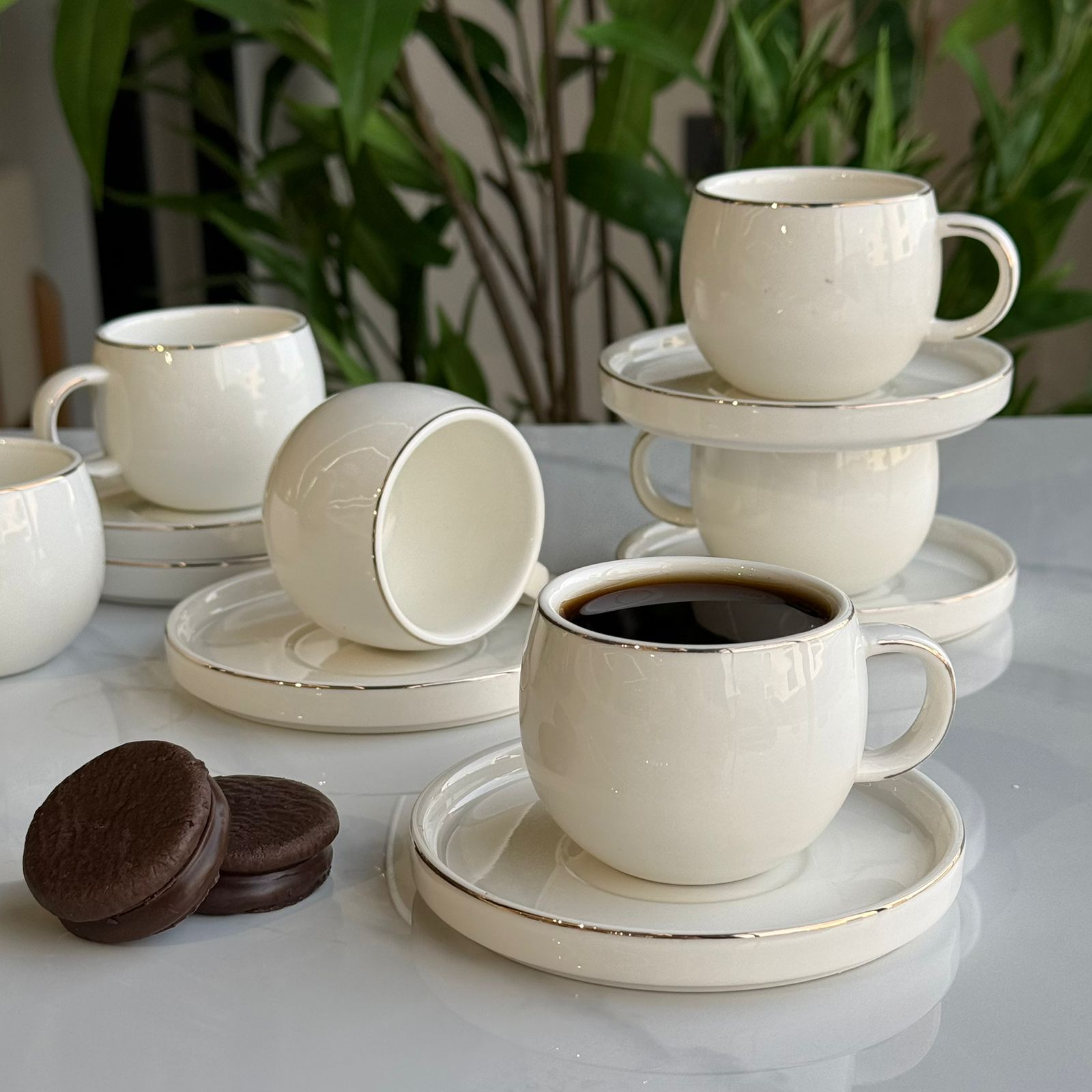 • طقم فناجين قهوة وصحون أنيق مصنوع من السيراميك عالي الجودة، ويتميز بتصميم خالد مثالي للاستخدام اليومي أو المناسبات الخاصة.