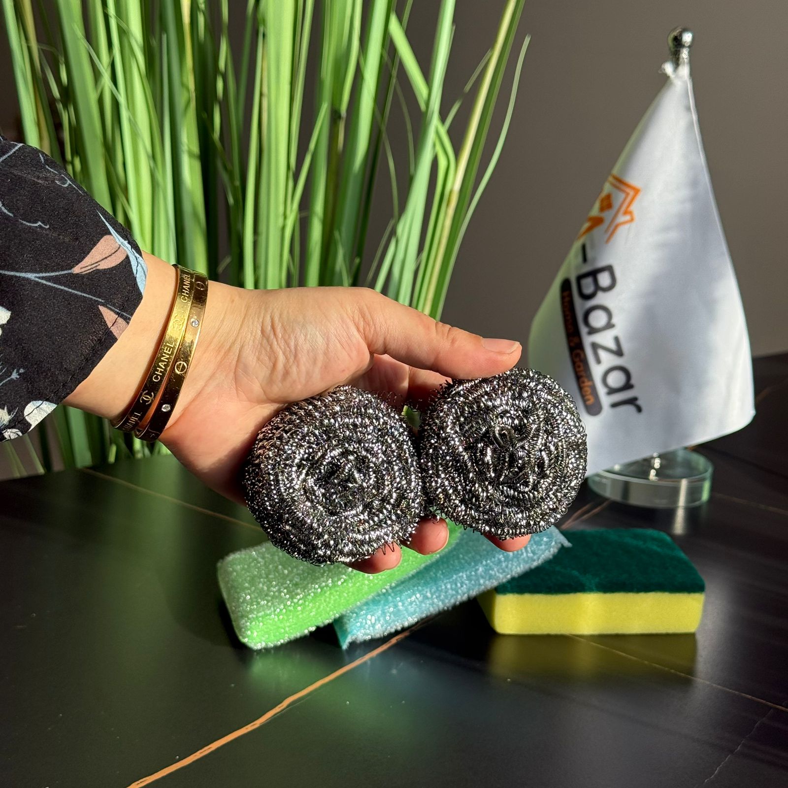 Includes 3 colorful foam sponges and 2 heavy-duty metal scrubbers